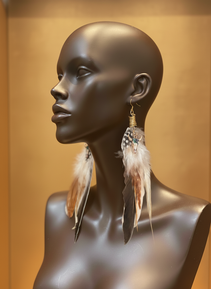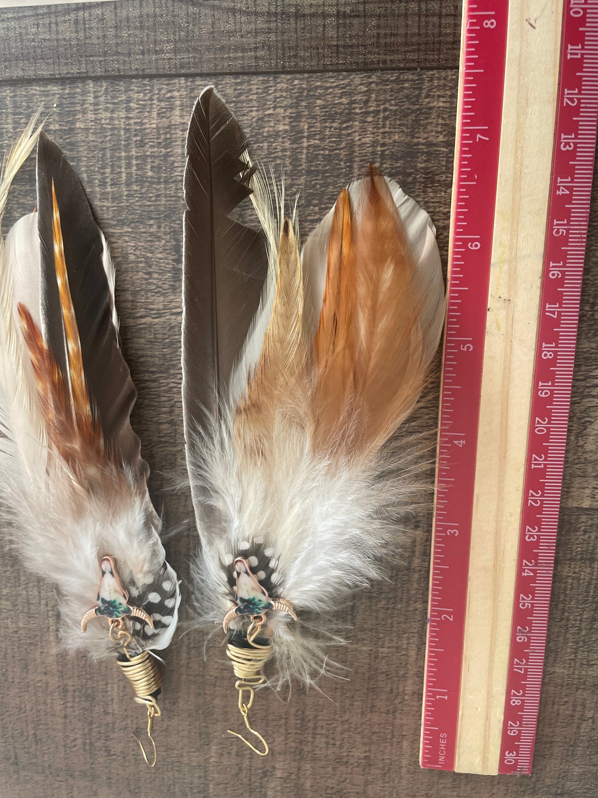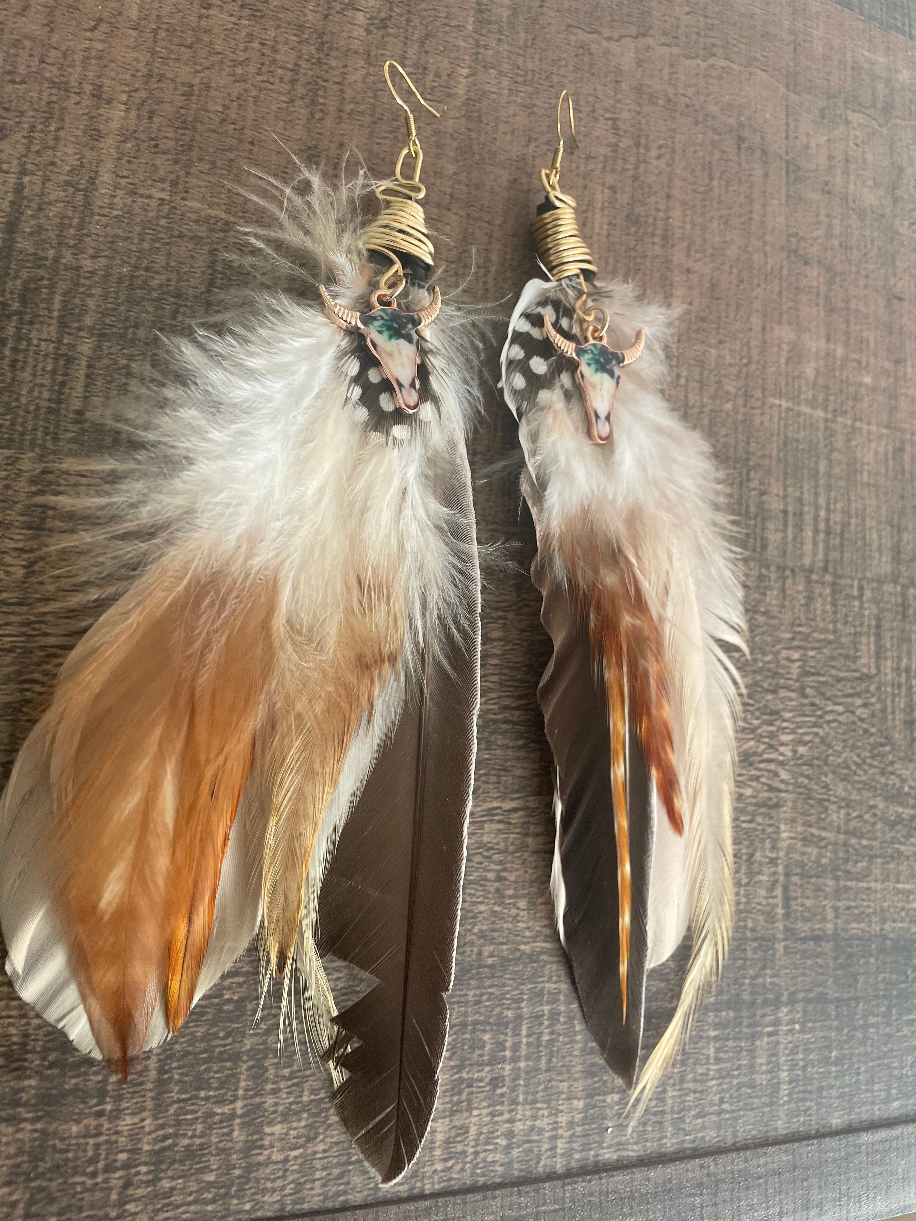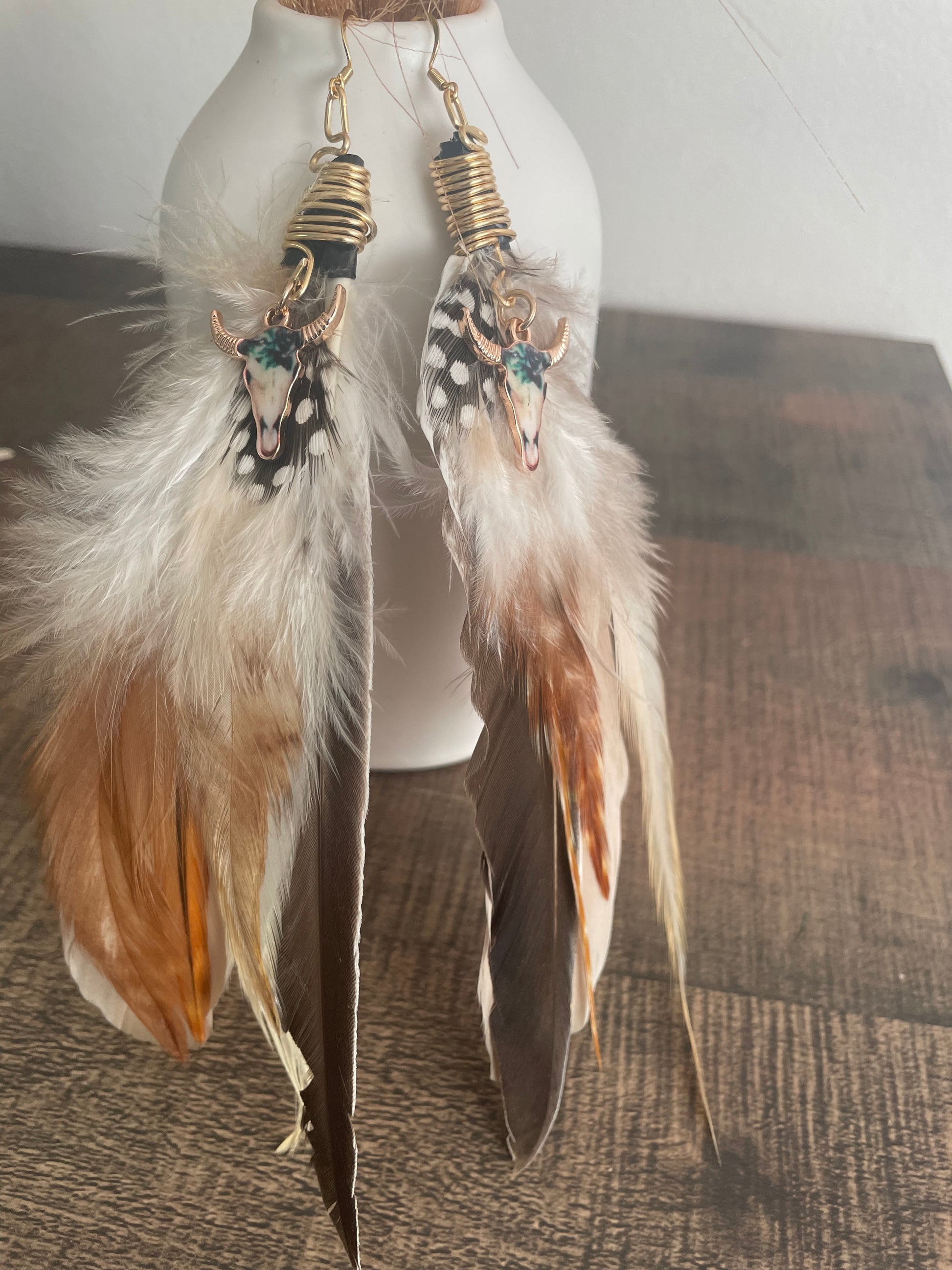 Arisai means “lion of God,” a name chosen for these earrings that embody courage, divine protection, and rooted power. Layers of cream, brown, and rust-toned feathers flow from golden coils, accented by a turquoise-tipped skull charm that symbolizes strength through transformation.