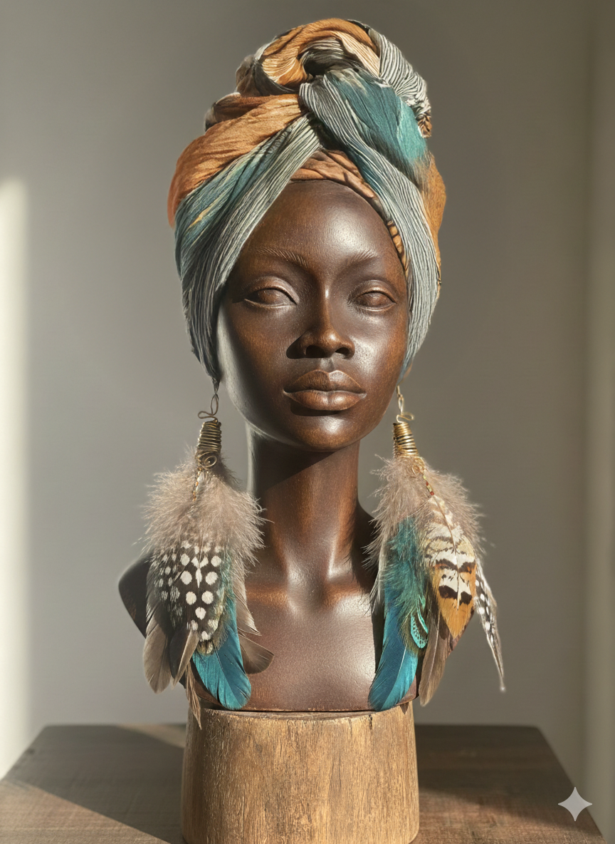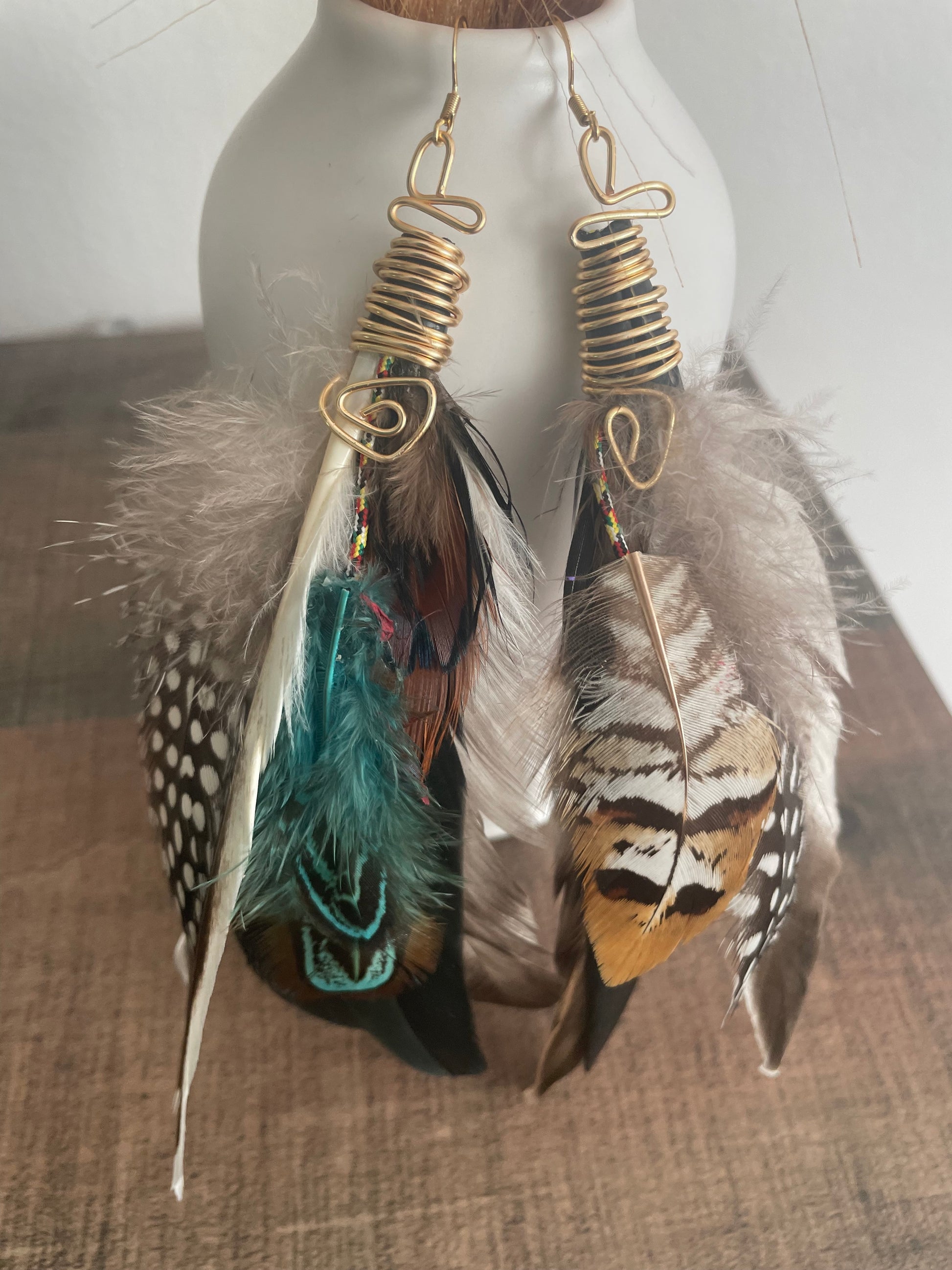 Ilyara means “light carrier,” a name that reflects the luminous, untamed energy of these handcrafted earrings. Layers of turquoise, cocoa, and cream feathers are accented with soft spotted plumes and wrapped in golden coil, symbolizing harmony between earth and air.